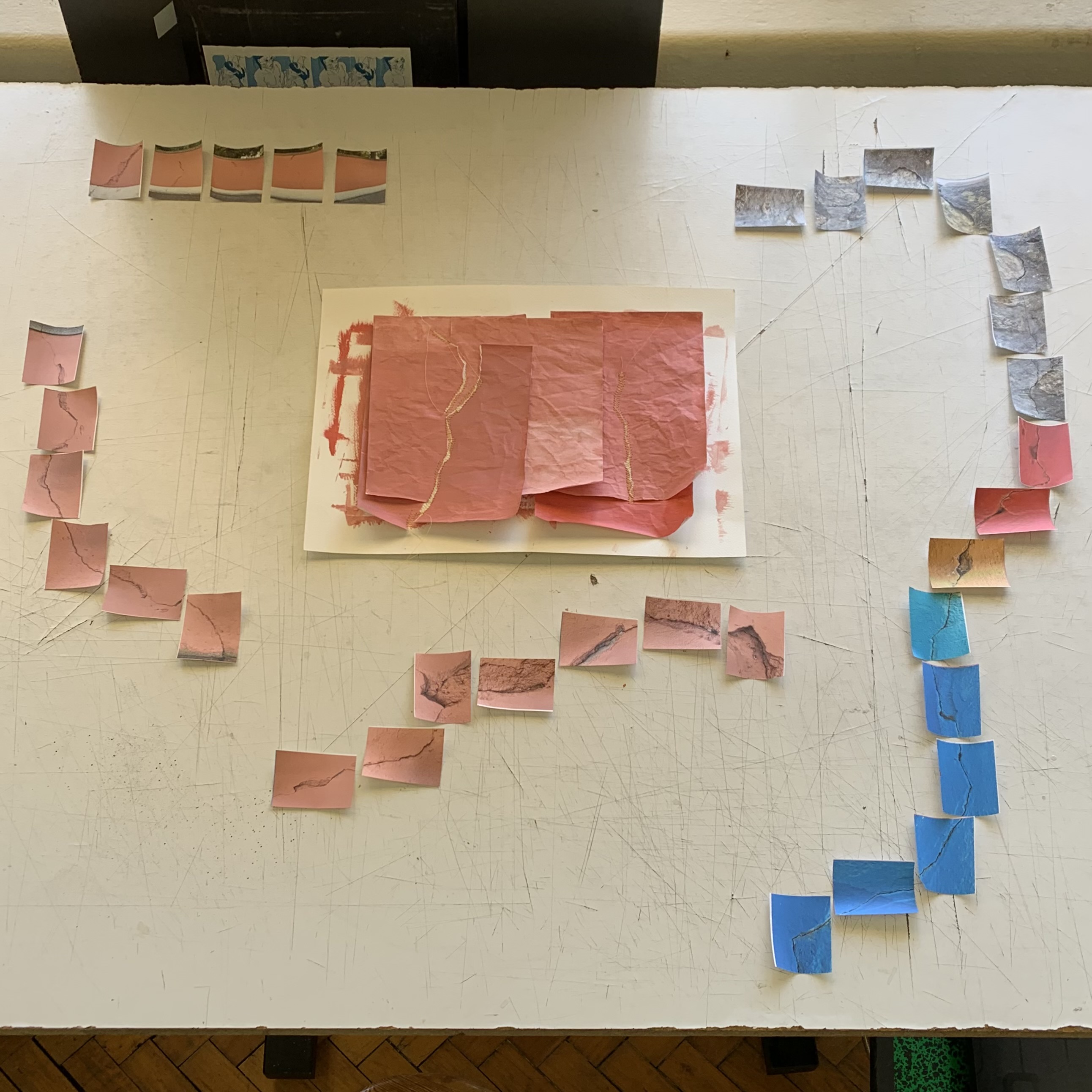 Uma ampliação da investigação sobre a temporalidade ao deslocar a experiência do tempo de uma visão bidimensional para uma composição escultórica tridimensional, utilizando cicatrizes como forma de inscrição topográfica de eventos passados. As marcas visíveis em uma superfície, interpretadas como arquivos somáticos que transcendem o mero vestígio biológico, revelam um fluxo de histórias e transformações que resistem às sucessivas camadas de intervenção, evidenciando uma cronologia própria da matéria. A impressão em papel reforça essa ideia de fragmentação e imperfeição, enquanto as cicatrizes simbolizam uma reconfiguração das trajetórias temporais e de memória, tornando-se uma metáfora de reinterpretação e ressignificação. Ao usar uma superfície plana para as impressões, cria-se um campo de experimentação, onde a fixidez da imagem ou objeto é subvertida pela possibilidade de manipulação contínua, criando uma temporalidade fluida que dialoga com o passado, o presente e o futuro em uma tessitura dinâmica. Assim, o projeto convida à reflexão sobre a plasticidade do tempo, a sua natureza contingente e performativa, e o papel da arte como espaço de reinterpretação constante de nossas próprias narrativas temporais.